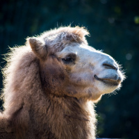 In the image, there is a camel standing with its head turned to one side. It appears to be outdoors during daylight, as suggested by