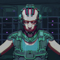 advanced technology and cybernetic components, suggesting they are part of a futuristic setting where human enhancements are common. The background features an interface that looks like the control panel of a spacecraft or some other high-