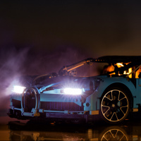 LEGO car is depicted with various details that mimic the real vehicle's design, including the distinctive gullwing doors and other racing elements such as vents and aerodynamic features.