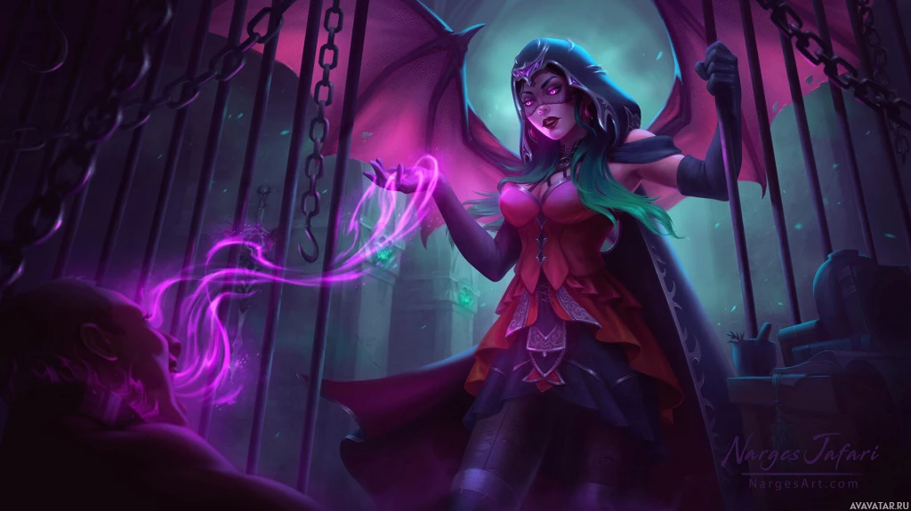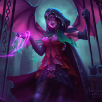gothic attire with elements that suggest they might be a succubus, given their demonic appearance and wings. This character is surrounded by