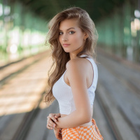 long hair and is wearing a white tank top with thin straps and high-waisted shorts. The background features a greenish structure that appears to be part of