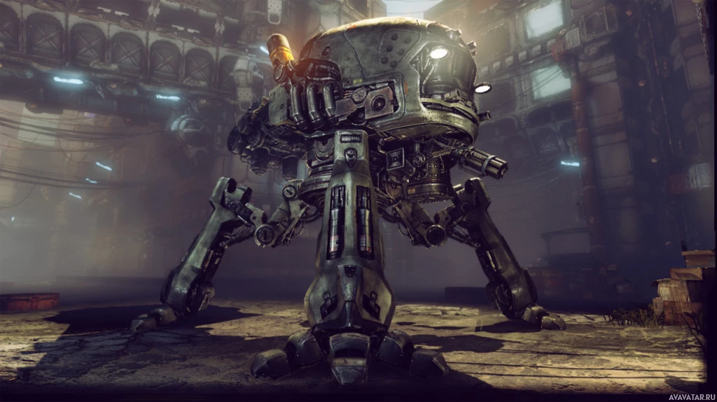 heavy machinery designed for industrial purposes in a dystopian or post-apocalyptic environment. The robot has a bulky frame with multiple articulated limbs and various mechanical components, suggesting