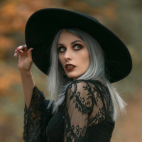 black hat that could be interpreted as a witch's hat due to its distinctive shape. The person is posing with their body turned slightly towards the camera, giving