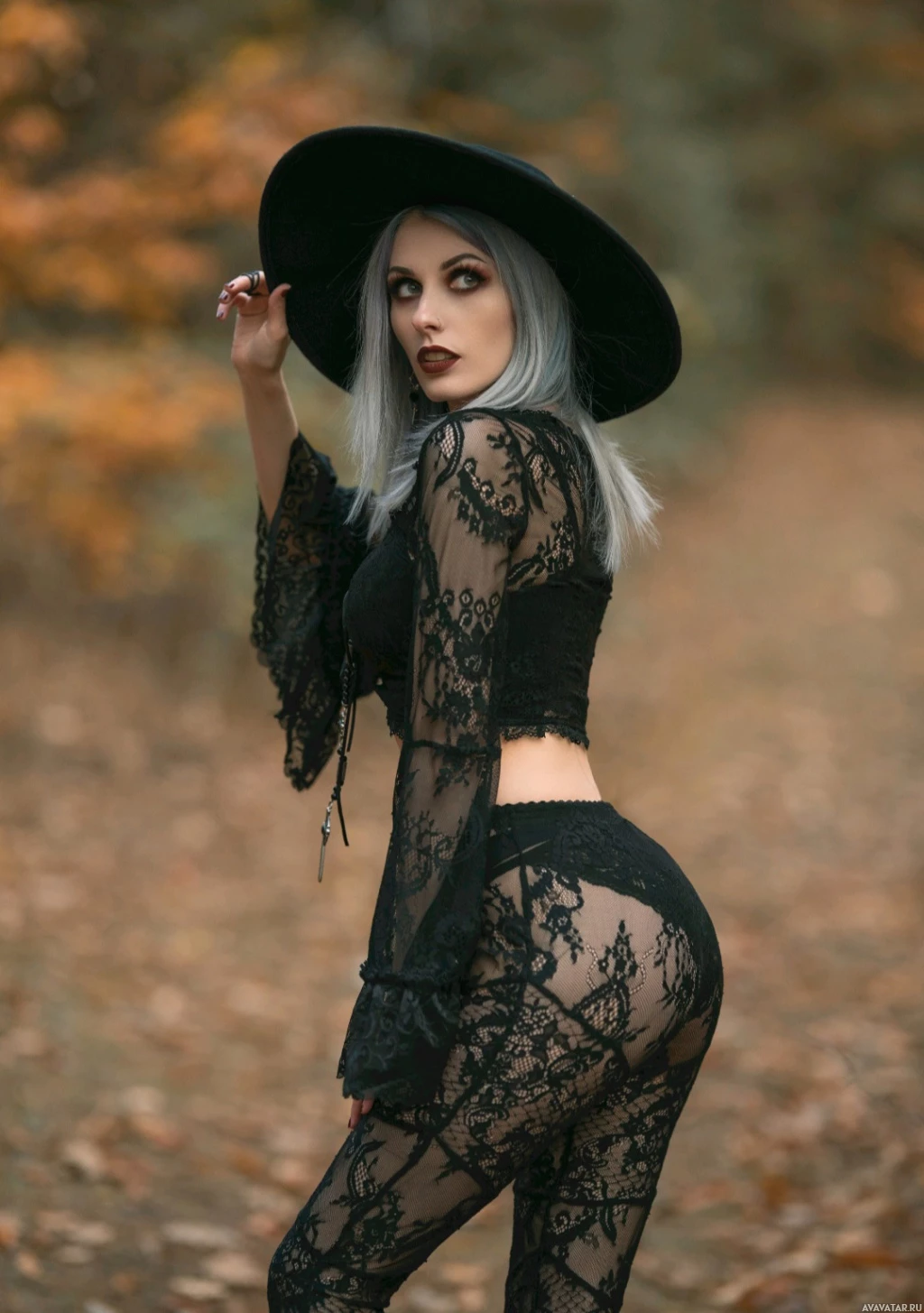 fallen leaves. The individual is wearing a black lace bodysuit and has silver-