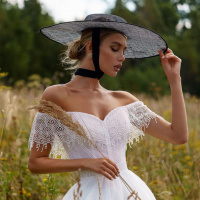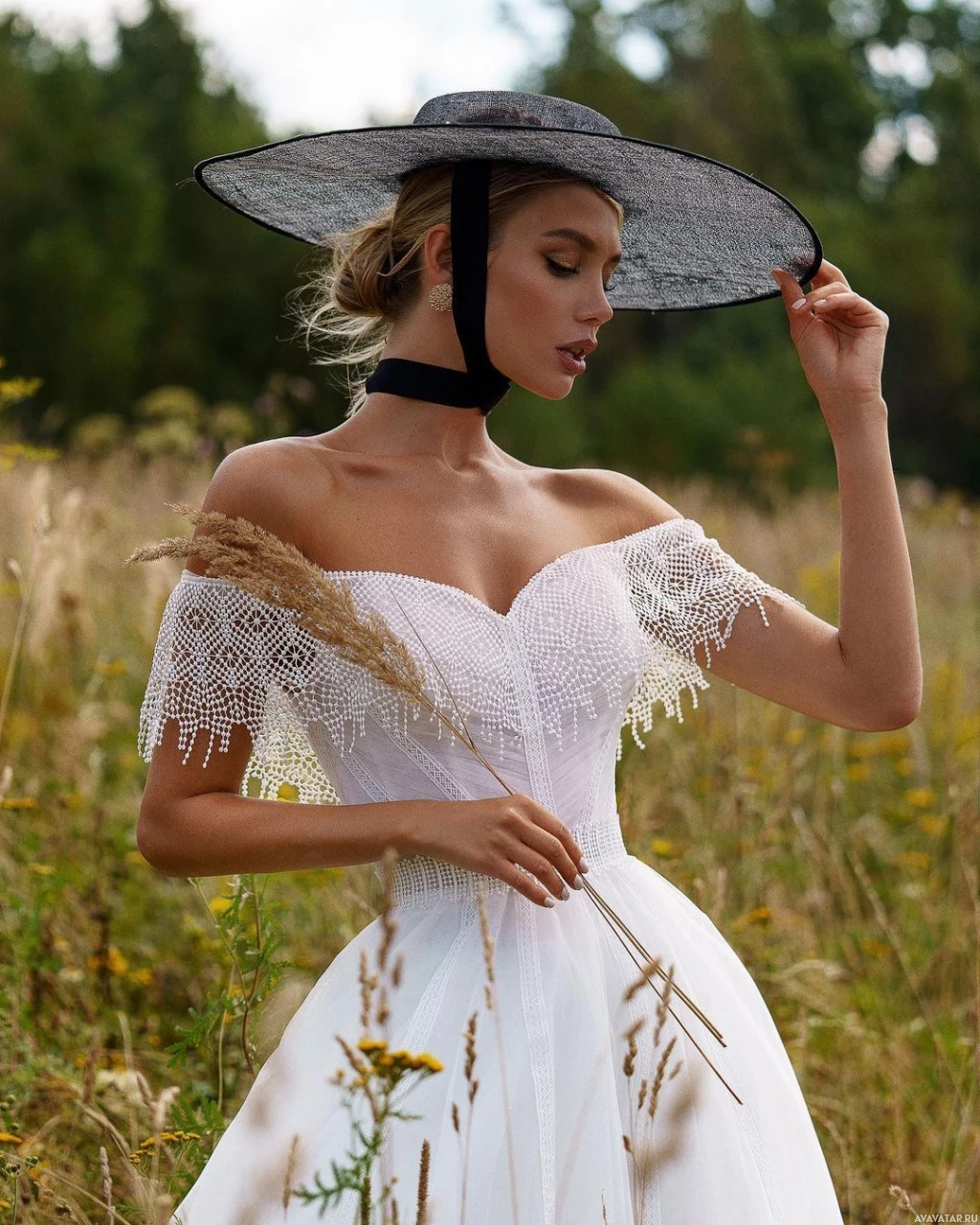 На картинке изображена девушка, которая, кажется, смотрит вниз. На ней платье с кружевными деталями и широкополая шляпа. Кажется, что это открытое поле с высокой травой или пшеницей, что наводит на мысль о естественной обстановке на открытом воздухе.