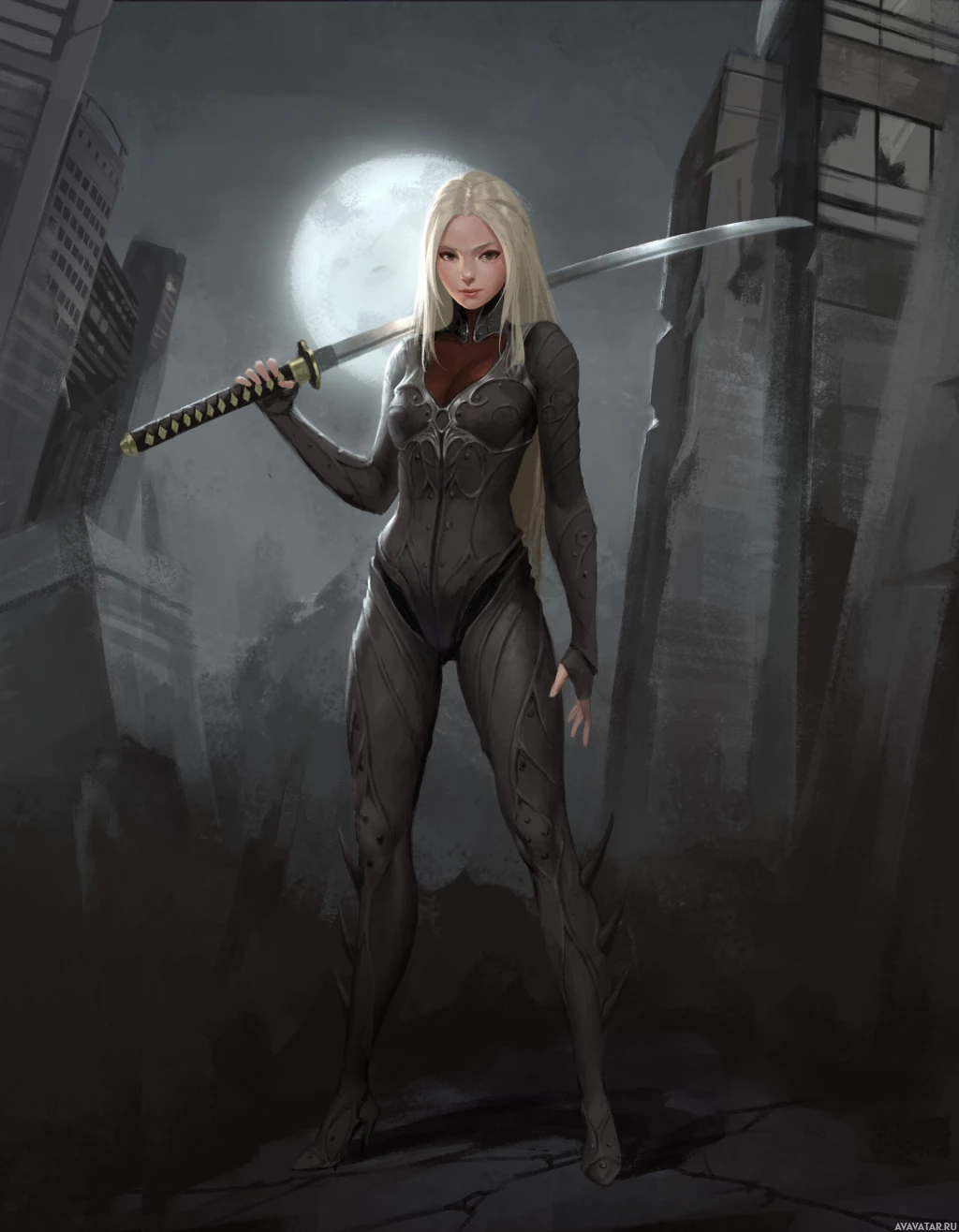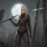 illustrated character. The girl in the picture is a blonde with shoulder-length hair and a sword in her hand, suggesting she might be a warrior or fighter of some sort. She is standing on what looks like a battlefield or ruined city during nighttime, as indicated by