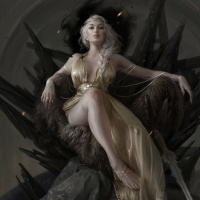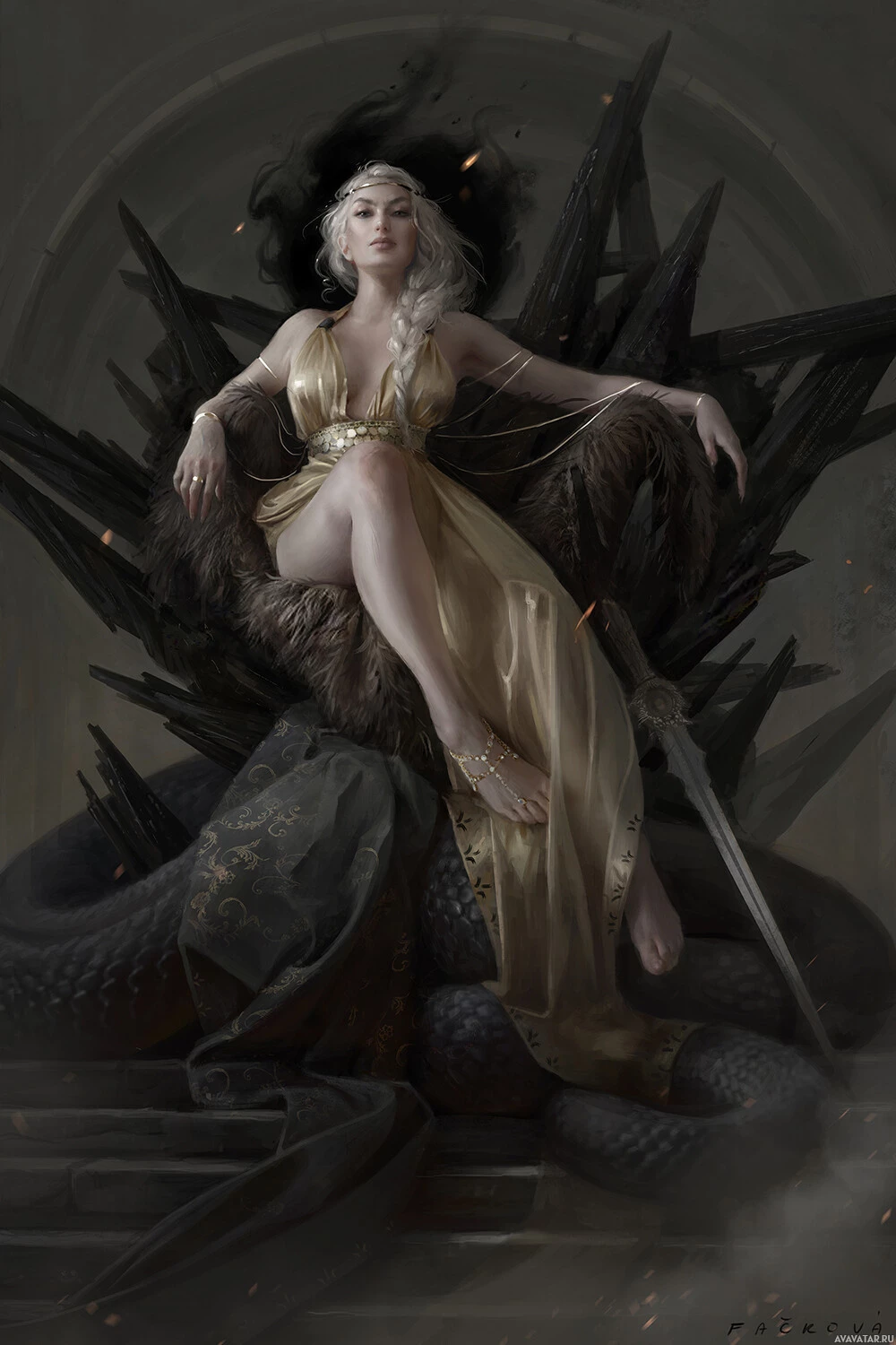 a female character with white hair, wearing a dress. She is seated on a throne-like chair that resembles the Iron Throne from "