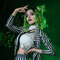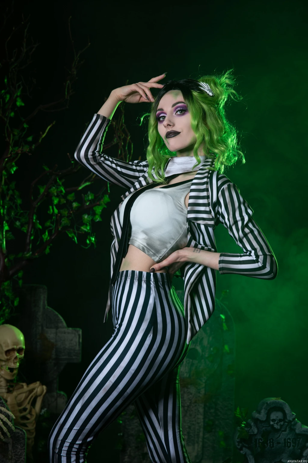 a person in costume, likely portraying a character from the movie "Beetlejuice," given that it is described as a cosplay of that film. The individual is wearing