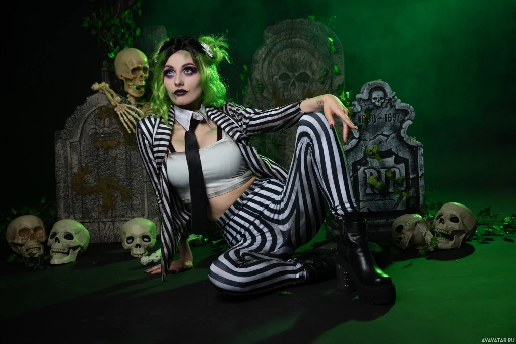 In the image, there is a person dressed in a costume that resembles Beetlejuice,