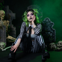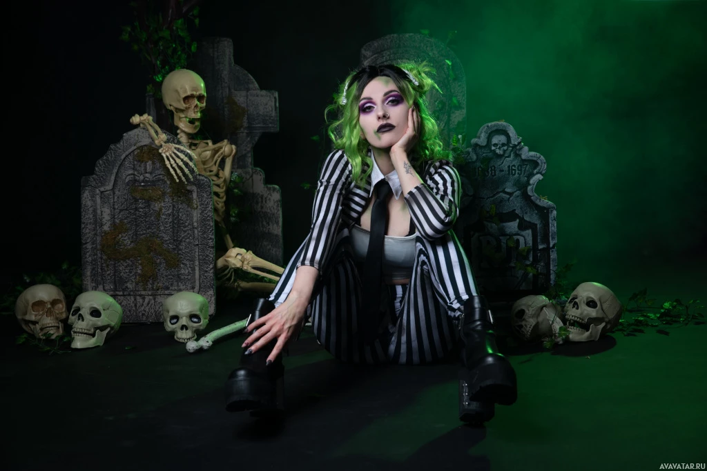 a signature look for Lydia from the movie. The scene is likely set up to mimic the characters' environment in "Beetlejuice."