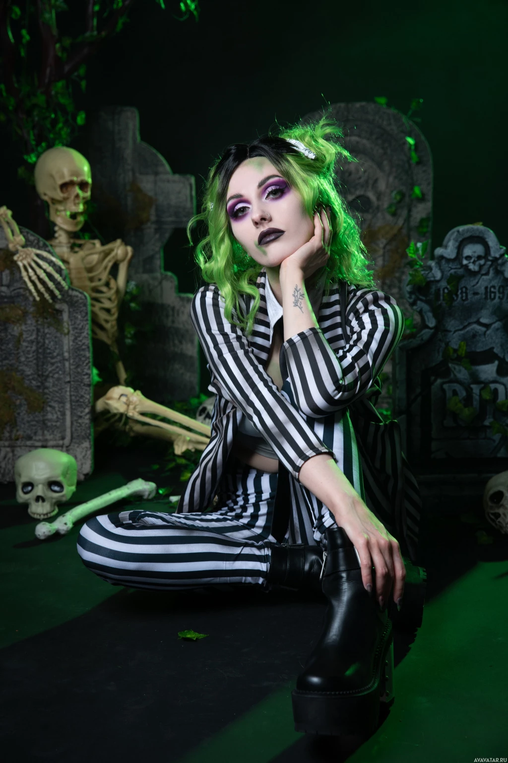 The image shows a person dressed in a costume that appears to be inspired by the character Lydia from the movie "Beetlejuice." The individual is sitting on what looks like a stage set designed for a Halloween theme, with skeletal props and green lighting that gives it