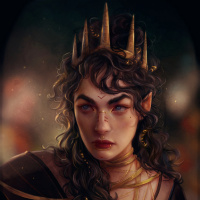 fantasy lore. They are wearing ornate jewelry and a headpiece that might suggest royalty or