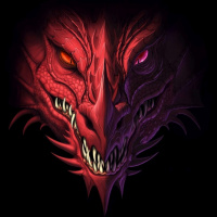 sharp teeth, spiky elements like horns or tails, and intricate details that suggest a mythical or magical nature. The colors used for these creatures are primarily red and purple, which gives them an intense and menacing look. This image could be associated with