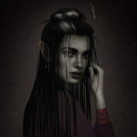 black hair and is wearing a purple outfit with a high collar that could be part of a historical or fantasy costume. The background has a textured appearance and a muted color palette that adds to the overall