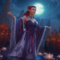 a body of water, possibly a lake, which are illuminated by lanterns, giving off a serene ambiance. In the background, there is a moon visible in the sky, contributing to