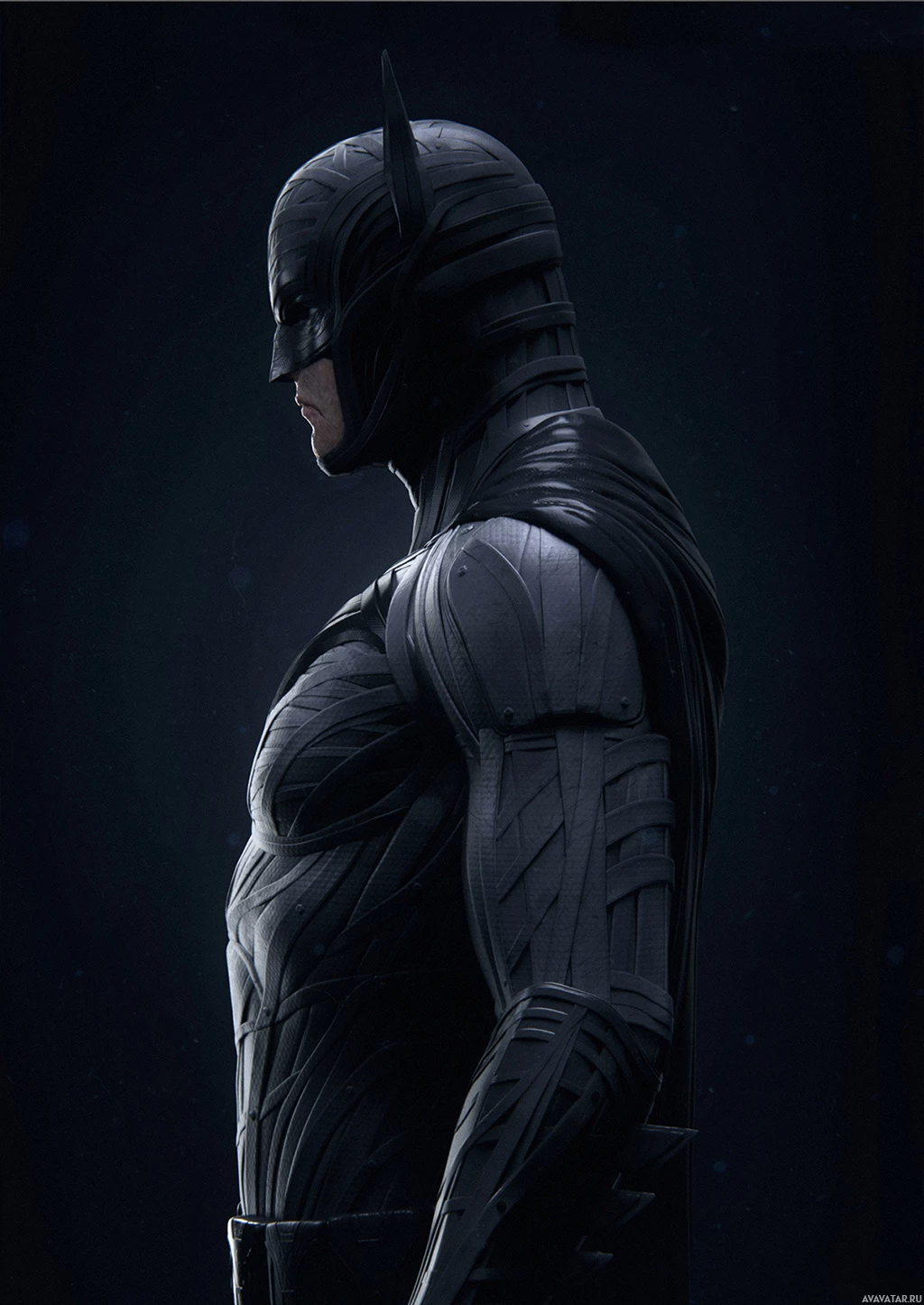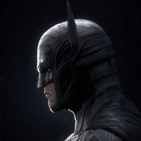 bat emblems on the chest and cowl. His cape, which is not fully visible in this image, is also part of his distinctive appearance. The character's posture suggests he is ready for action or is deep in thought.