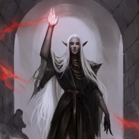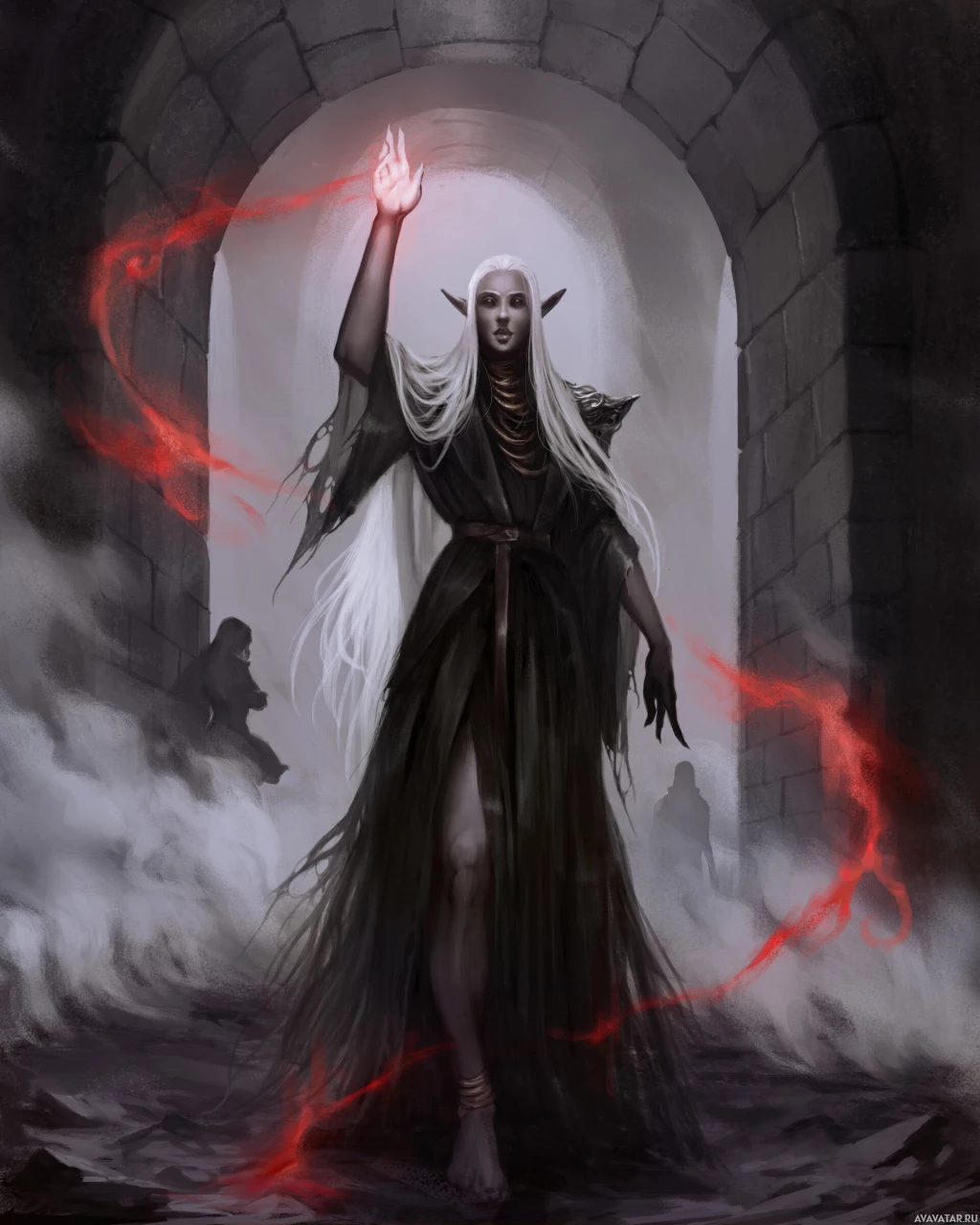 The image depicts a character from fantasy media, commonly referred to as a "drow" due to