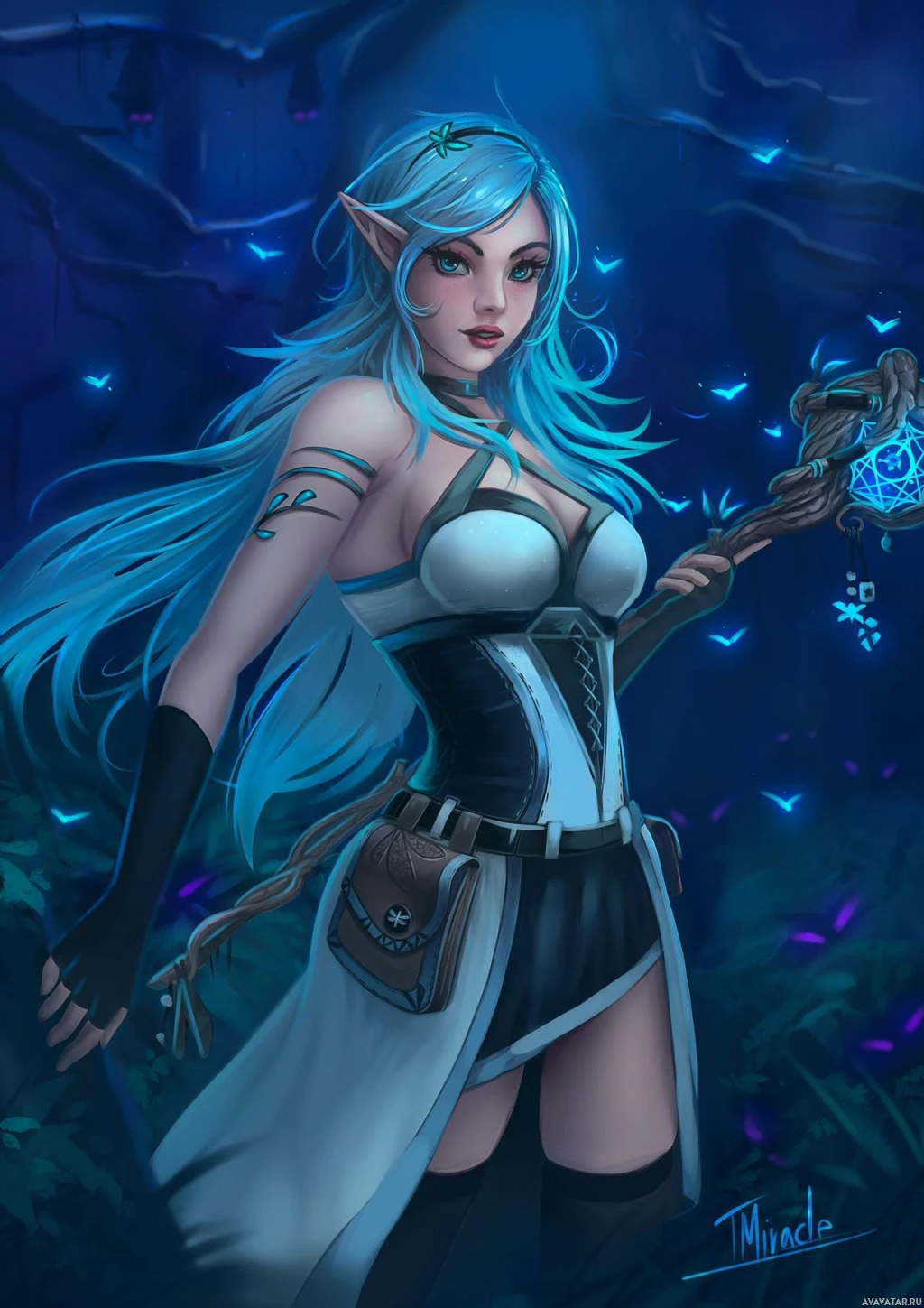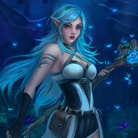 blue hair and is wearing a white top with blue accents, paired with black pants and boots, along with a brown bow on her left side. In her right hand, she's holding what looks like a staff or wand with a glowing