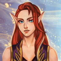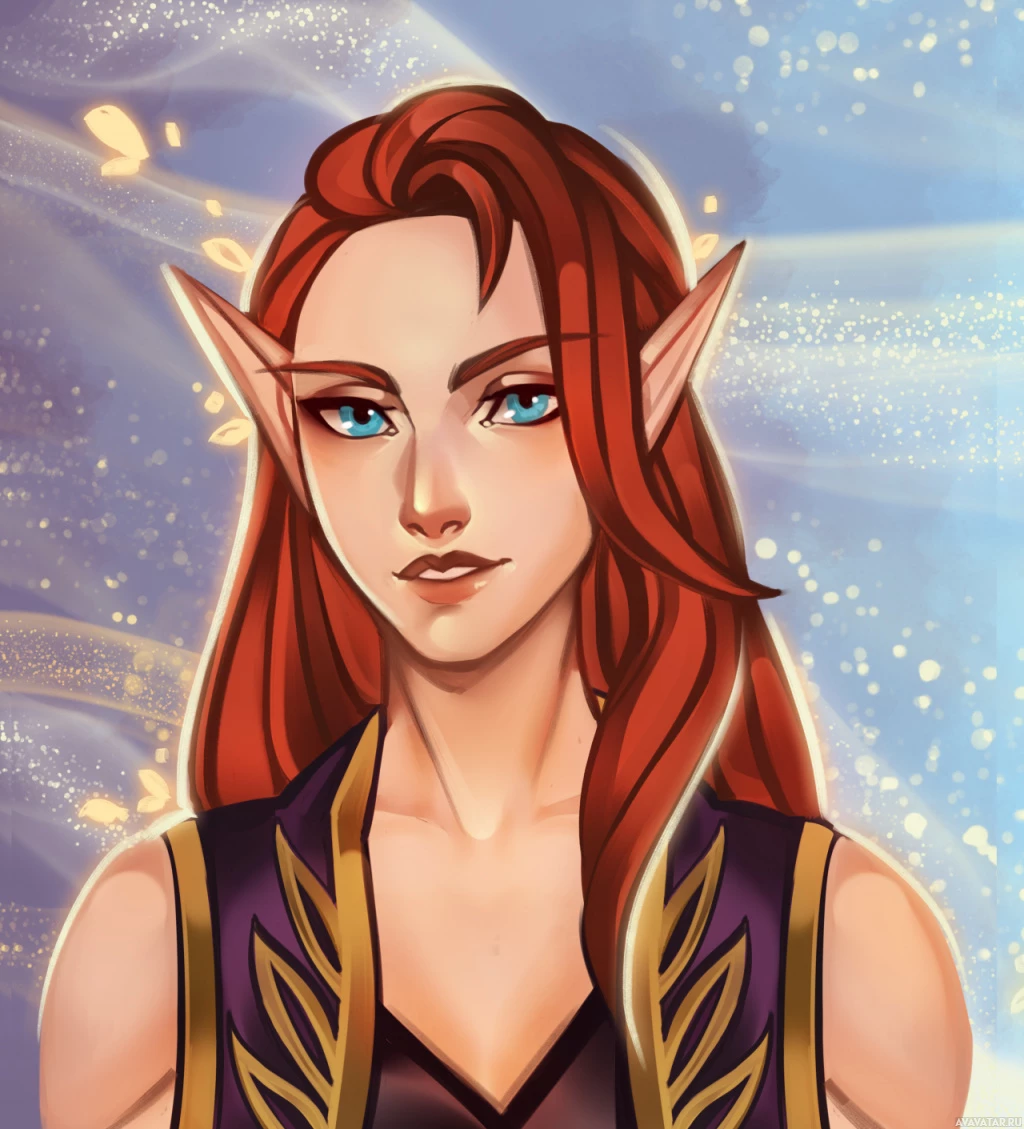 a female character with red hair, styled in an elongated manner. She has pointed ears and