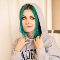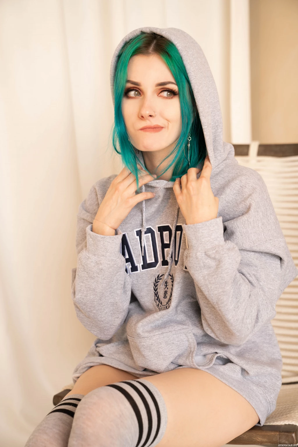turquoise hair and are wearing a hooded sweatshirt with the text "Adidas" printed on it. Their attire includes