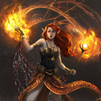 a female character with red hair, her eyes are closed, and she is wearing an outfit that suggests a fantasy or elven theme. She appears to be casting spells or using magic, as evidenced by the flames she holds in each hand. There's also a wing-like accessory on her back, which might imply that she has some sort of avian or mythical being aspect to her character. The overall aesthetic is one typically associated with fantasy artwork.