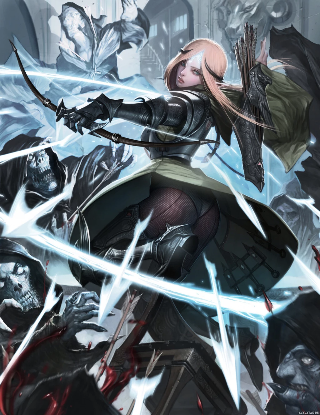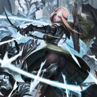 a fantasy scene with an elf character in the foreground. The elf is shown from behind, holding a bow and aiming it forward. She has
