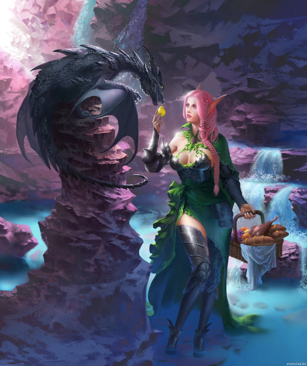 pink hair and is dressed in a green, fantasy-style dress with elements of armor, suggesting she might be a warrior or guardian type of character. To the left of her stands a dragon, which adds to the fantastical theme of the image. The background appears to be a cenote, a natural sinkhole that often contains groundwater, which is common in regions like Yucatán in Mexico. The overall atmosphere of the picture conveys
