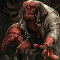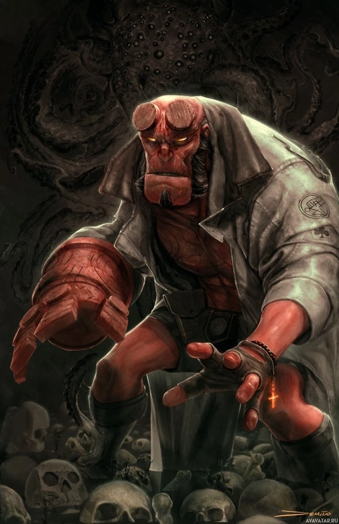 The image depicts a character known as Hellboy, who is part of the Hellboy series created by