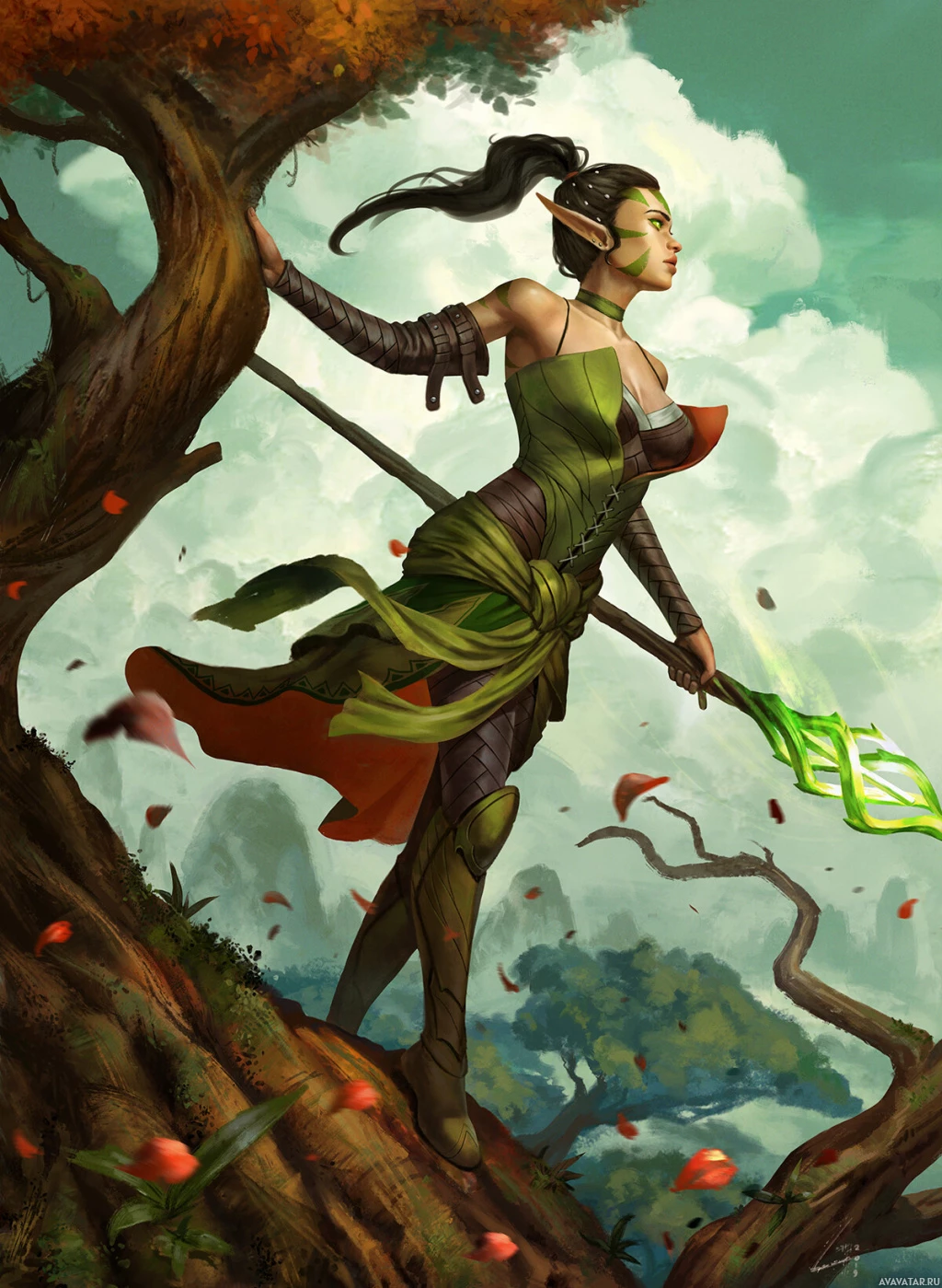 a fantasy setting. She is dressed in green and gold armor, suggesting she may be of
