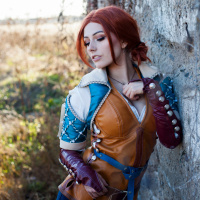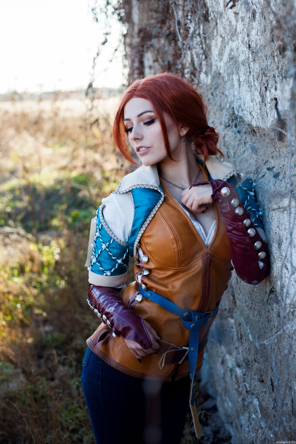 In the image, there is a person dressed in cosplay as Triss Merigold from "The Witcher 3: Wild Hunt"