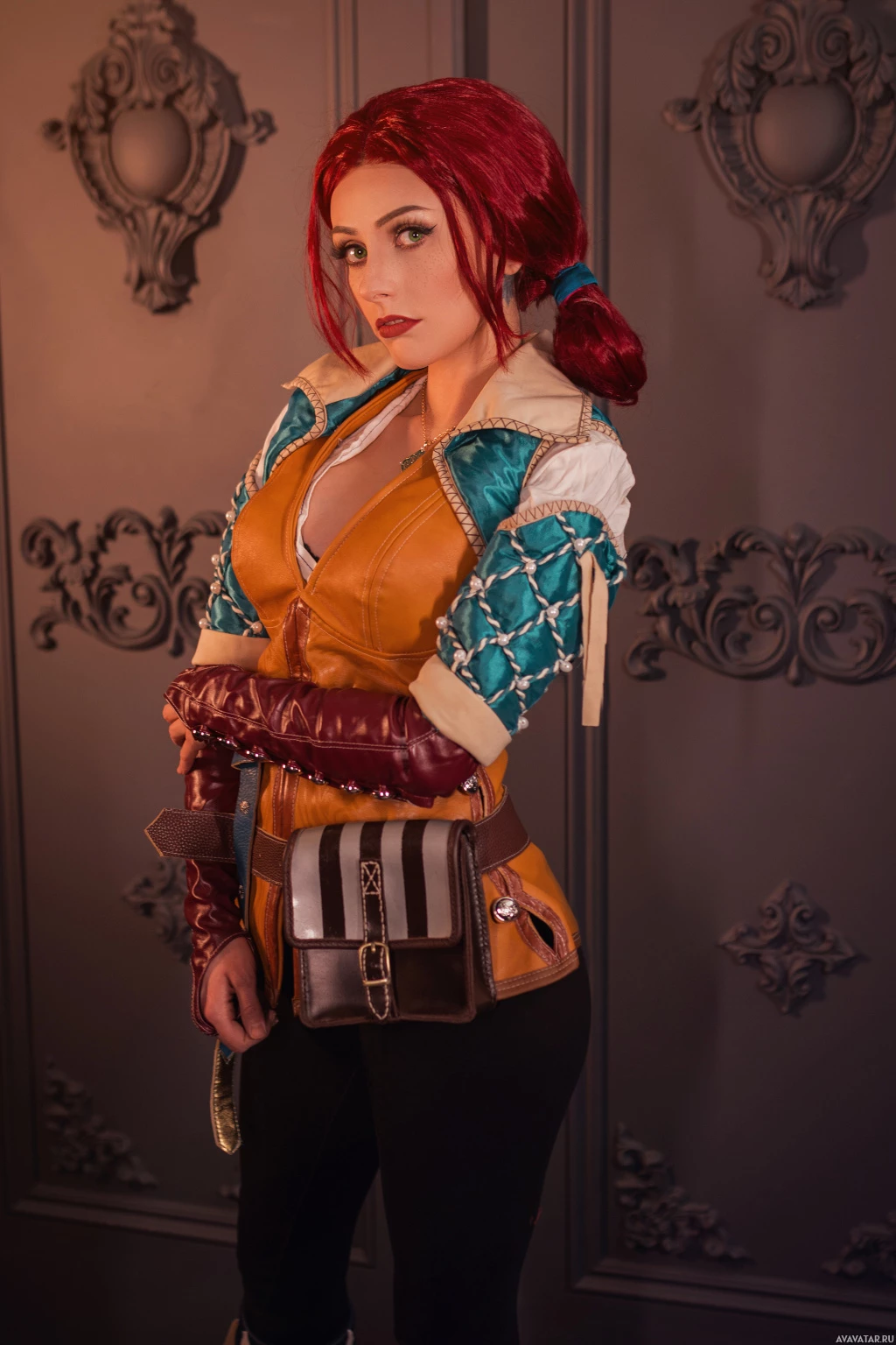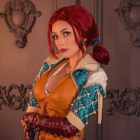 The image features a person cosplaying as Triss Merigold from