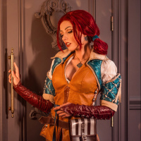 Triss Merigold, a character from the "The Witcher" game. They are wearing a costume that includes a brown