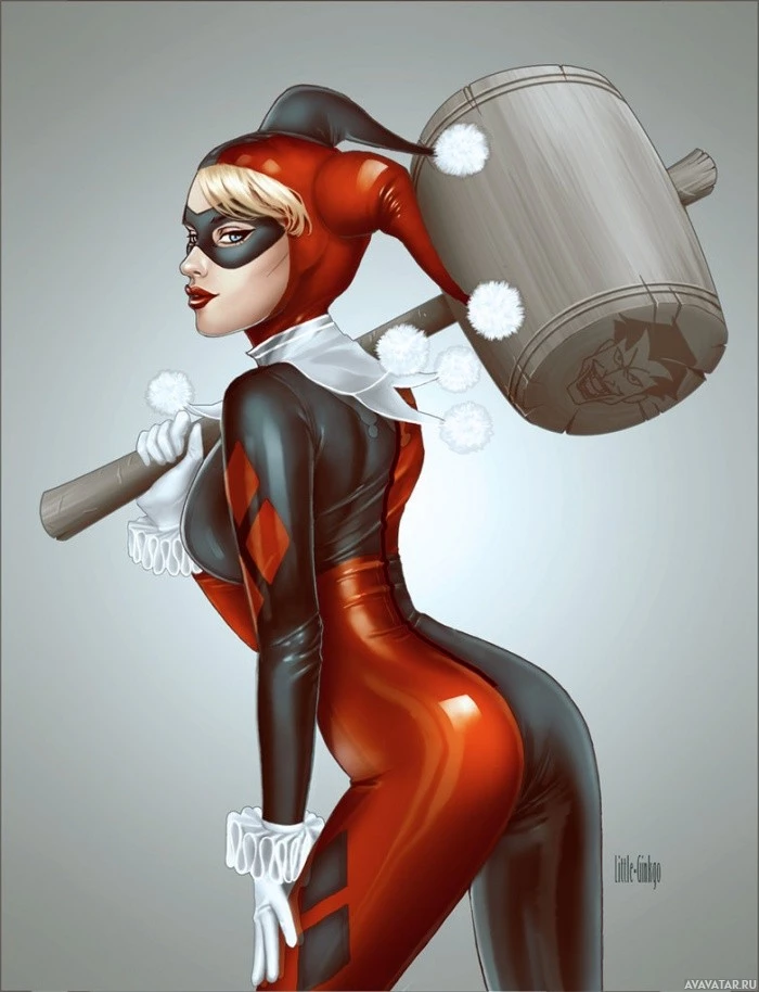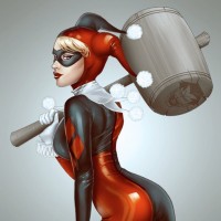 Marvel Comics, while in the other hand, she carries a large wooden mallet known as "The Joker's Hammer" or the "Big Bertha," typically used by her character when she appears as Harley Quinn. The style of the illustration is detailed and vibrant, capturing