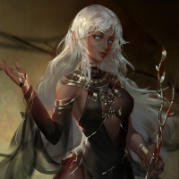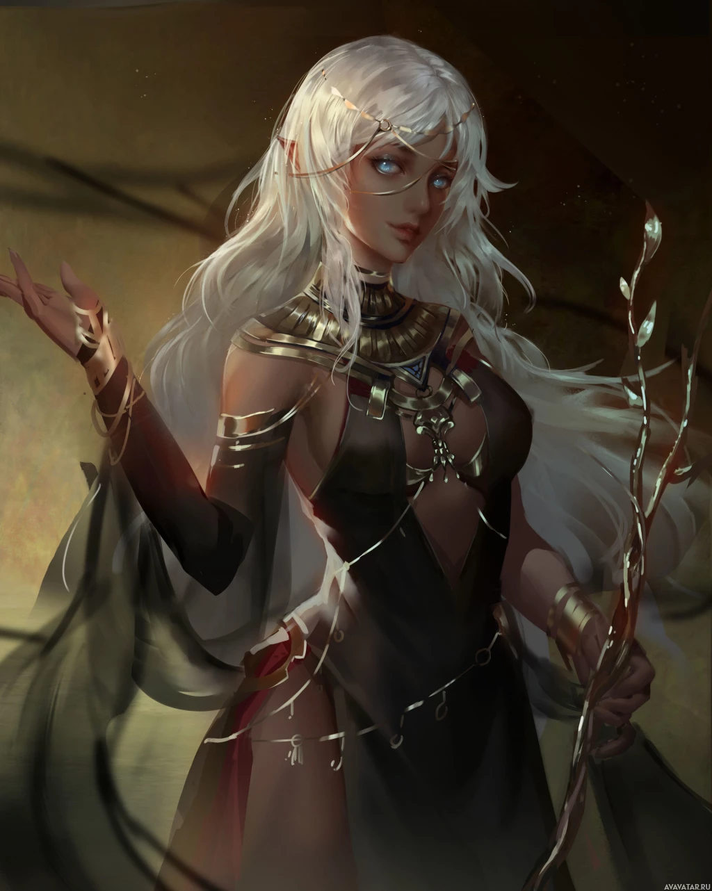 a dark dress with intricate details that could indicate a high status within her society or role. The character is holding what seems to be a staff, which is often associated with magic and power in