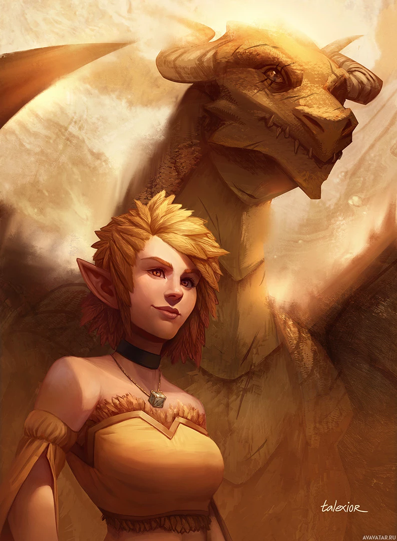 The image depicts two characters, a female with elven features and a male dragon, in
