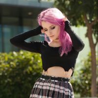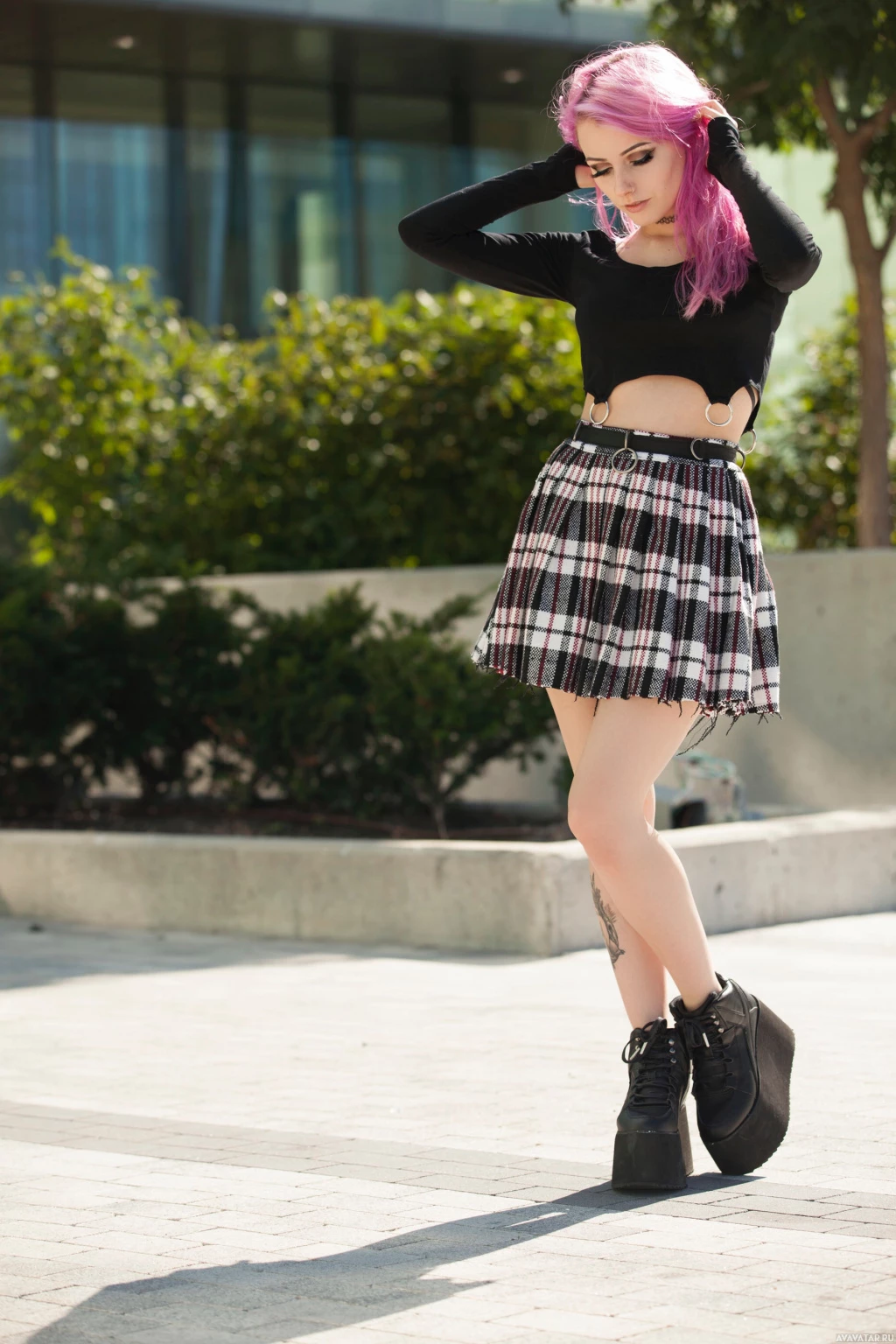 a black top with a white design, a plaid skirt, high-heeled boots, and have a tattoo visible on their left arm. The background suggests