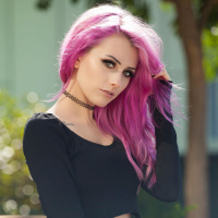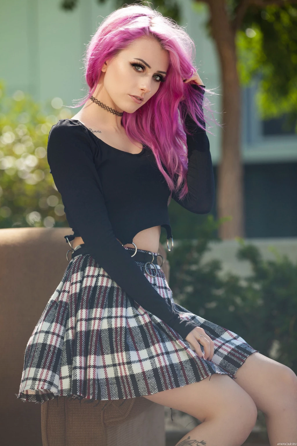 a black top and a skirt that has a plaid pattern. Her style seems to include elements of both casual and edgy fashion, such as the punk