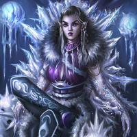 an elf character. She is seated on what appears to be a throne made of ice and adorned with snowflakes, which suggests that the setting is likely in a winter or