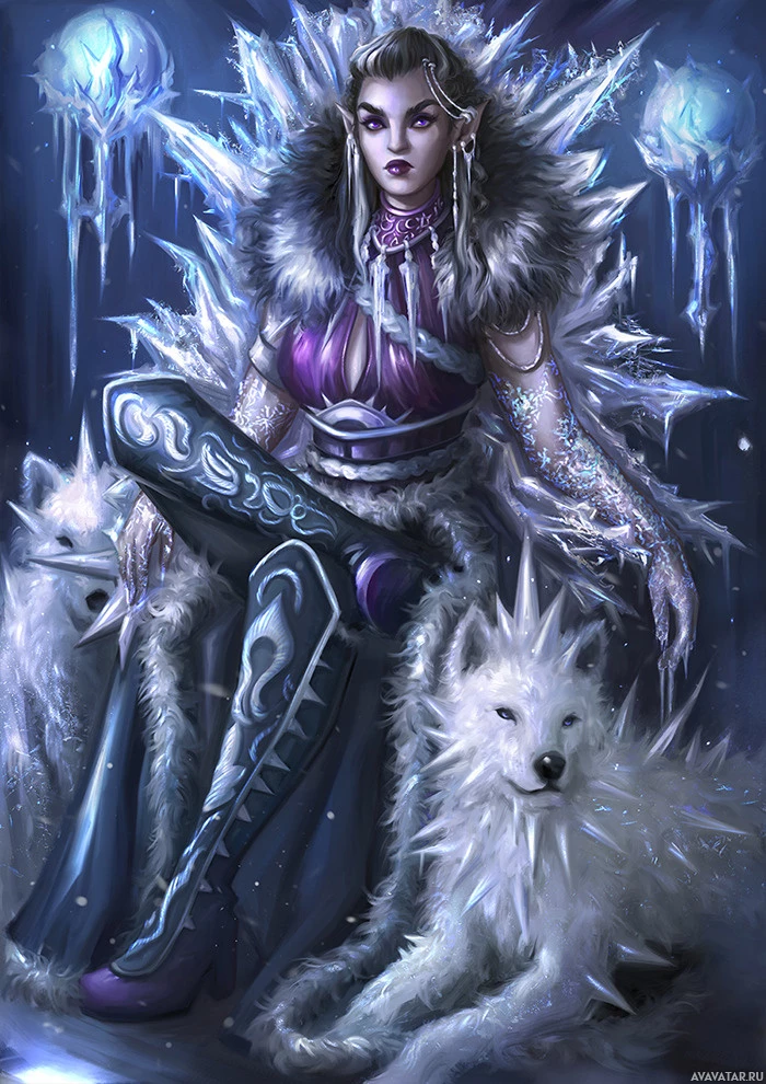 long hair and pointed ears, which are characteristic features of fantasy elves. She's wearing what seems to be fur and winter clothing, indicating her adaptation to the cold environment. Next to her is a white wolf, which is often associated with strength and loyalty in