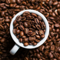 На картинке изображена чашка кофе, из которой молотый кофе высыпается через край в горку цельных кофейных зерен на поверхности. Скорее всего, это художественное или символическое изображение, возможно, подчеркивающее превращение сырых зерен в готовый напиток.