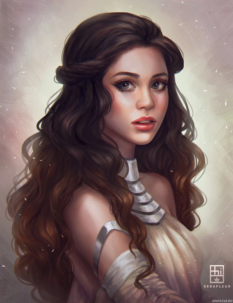 a fair complexion and is wearing what appears to be a silver necklace or armor piece on her left shoulder. Her expression is neutral as she looks straight ahead. The art style suggests it could be an illustration from a fantasy-themed book, game, or digital artwork.