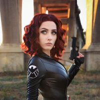 a fictional character from the Marvel Comics universe. This character is known for her skill as a spy and assassin, often seen with pistols or other firearms. The individual in the photo is also holding a pistol. The setting appears to be outdoors at dusk or dawn, given