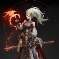 elaborate armor that includes shoulder guards, bracers, and boots, suggesting she might be a warrior or a figure of authority within her fictional setting. In her left hand, she holds a staff which has a red gem at the top and what appears to be a flame at its end, symbolizing