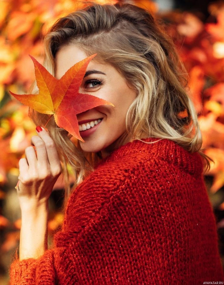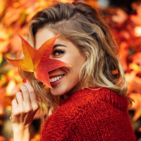 the autumn season. She is holding a red leaf, possibly a maple leaf, which is often associated with