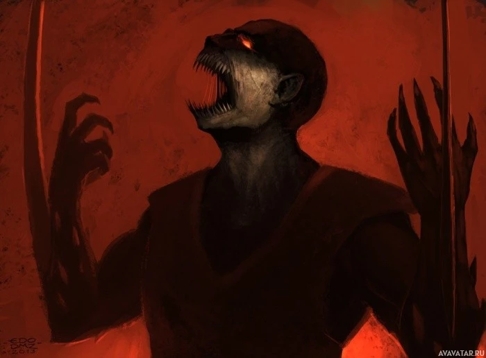 На картинке изображен персонаж, напоминающий Шиннока, демоническую сущность из серии видеоигр «Смертельная битва». Он показан с интенсивным выражением и когтистыми руками, поднятыми, как будто он собирается развязать мощную атаку или заклинание.