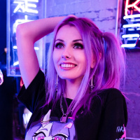 neon lights, which suggests the photo might have been taken in a bar or nightclub setting with a vibrant atmosphere. The person is smiling and seems relaxed.