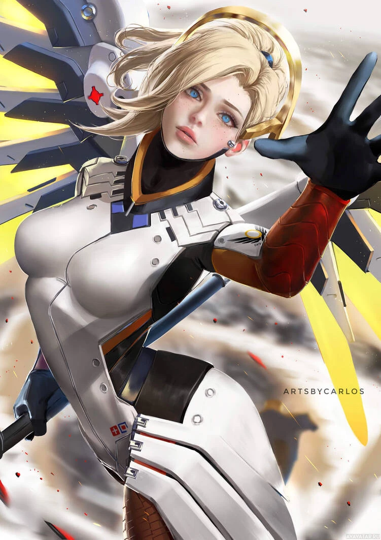 a support healer within the game, where she has the ability to heal teammates and provide temporary invulnerability shields. The artwork is detailed and colorful, typical of high-quality fan art or promotional materials for