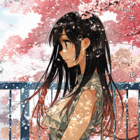 The image shows an animated girl with long dark hair. She has a contemplative expression on her face, looking off to the side as if she's lost in thought. There are cherry blossoms visible around her, indicating that she might be at a park during springtime when these flowers bloom. The setting is picturesque and serene.