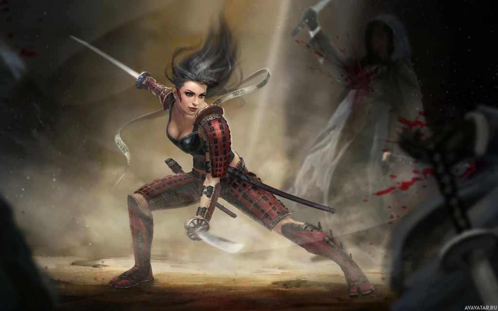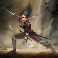 a samurai warrior, and is holding two swords crossed in front of her body. In the background, there appears to be some chaos or