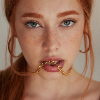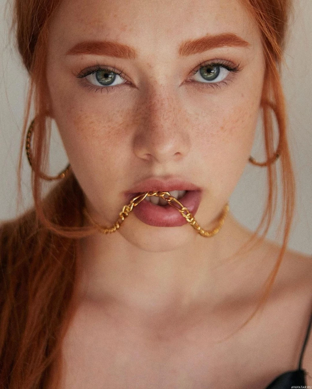 red hair and fair skin. She appears to be wearing makeup, including eyeshadow and lipstick that matches her hair color. The woman is also wearing gold
